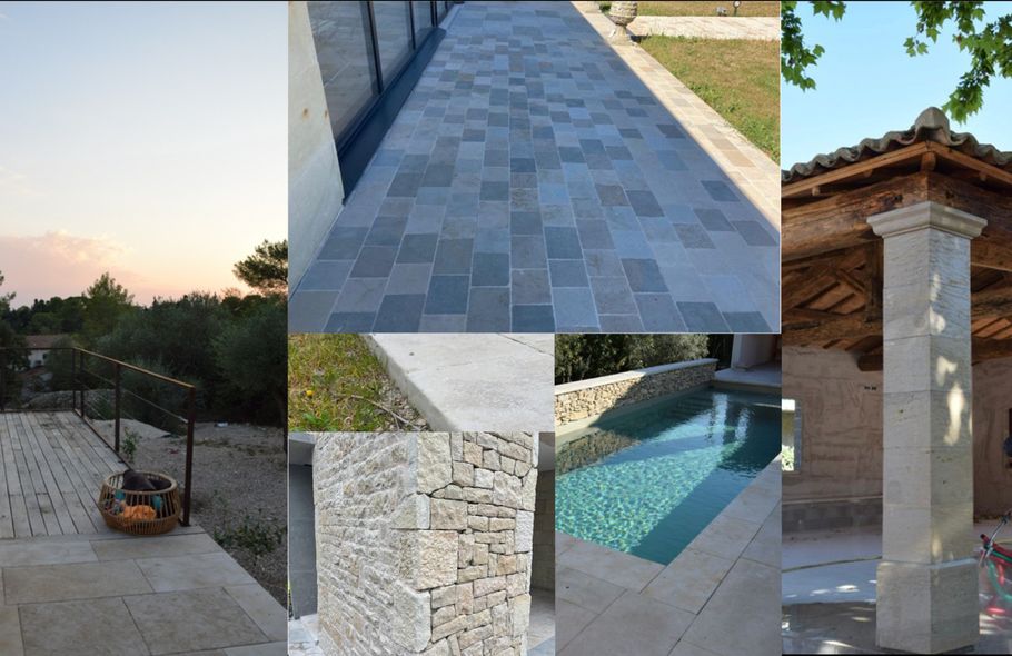 Elle se compose de Margelles, Couvertines, Marches, Fontaines, Pavés, Parement, Angles, Pas Japonais et Banc.